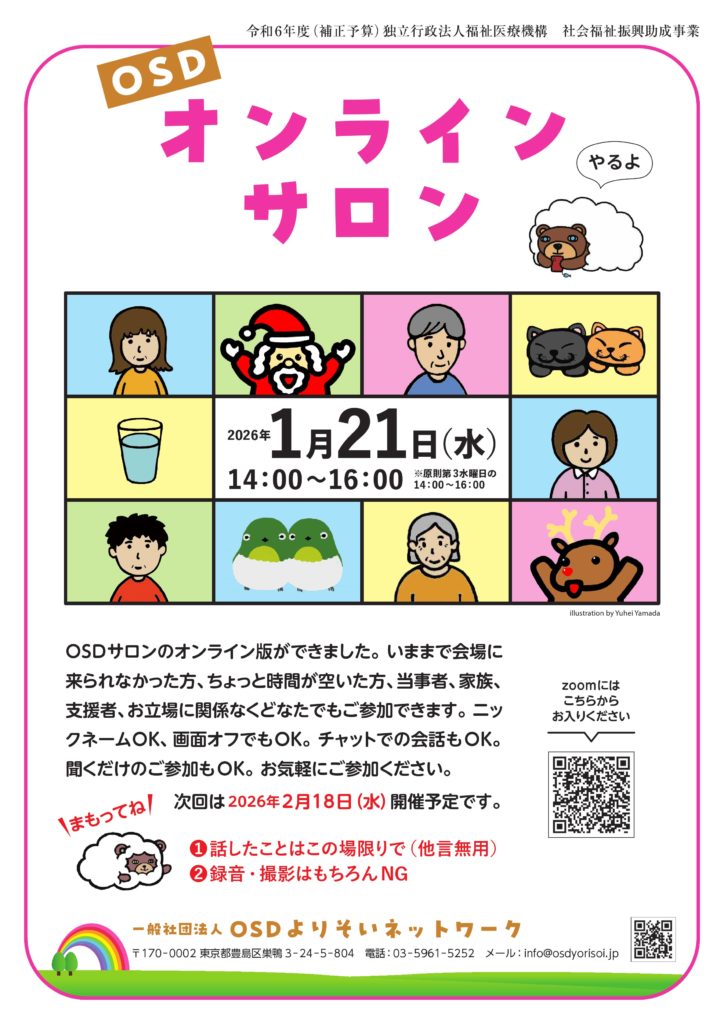 OSDサロンのオンライン版が出来ました。今まで会場に来られなかった方、ちょっと時間が空いた方、当事者、家族、支援者、お立場に関係なくどなたでもご参加できます。zoomで開催いたします。ニックネームOK、画面オフでもOK。お気軽にご参加ください。